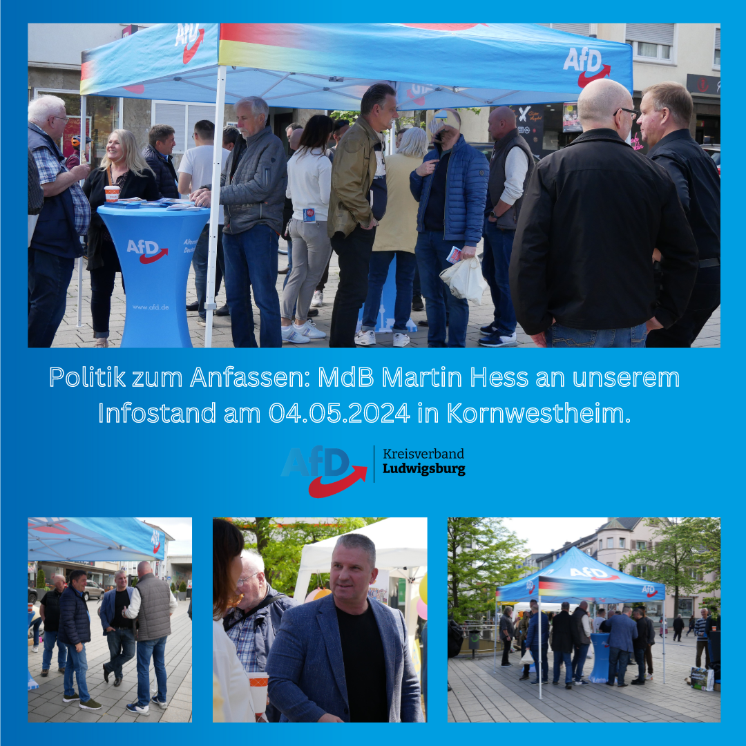 Am 04.05.2024 waren wir mit unserem Infostand in Kornwestheim. Mit dabei war unser Bundestagsabgeordneter Martin Hess.