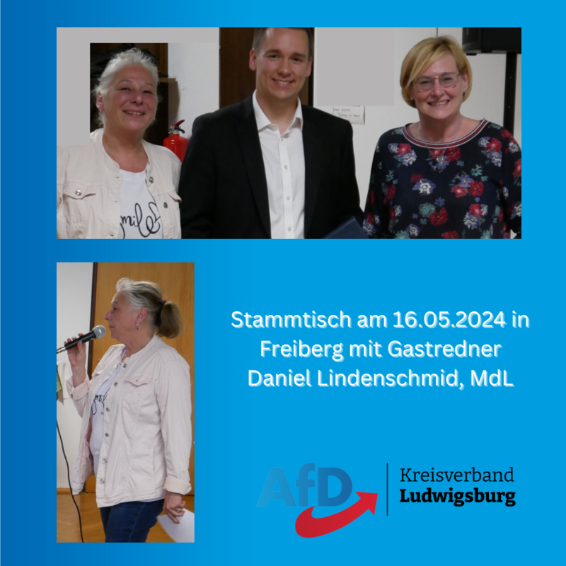 Die stellvertretende Vorsitzende des Kreisverband Ludwigsburg, Angelika Stosiek, konnte den Landtagsabgeordneten Daniel Lindenschmid als Redner gewinnen. Herr Lindenschmid ist Sprecher für Inneres, Digitales und Kommunales der AfD-Fraktion, Vorstand der AfD-Fraktion im Landtag von Baden-Württemberg und Parlamentarischer Geschäftsführer.