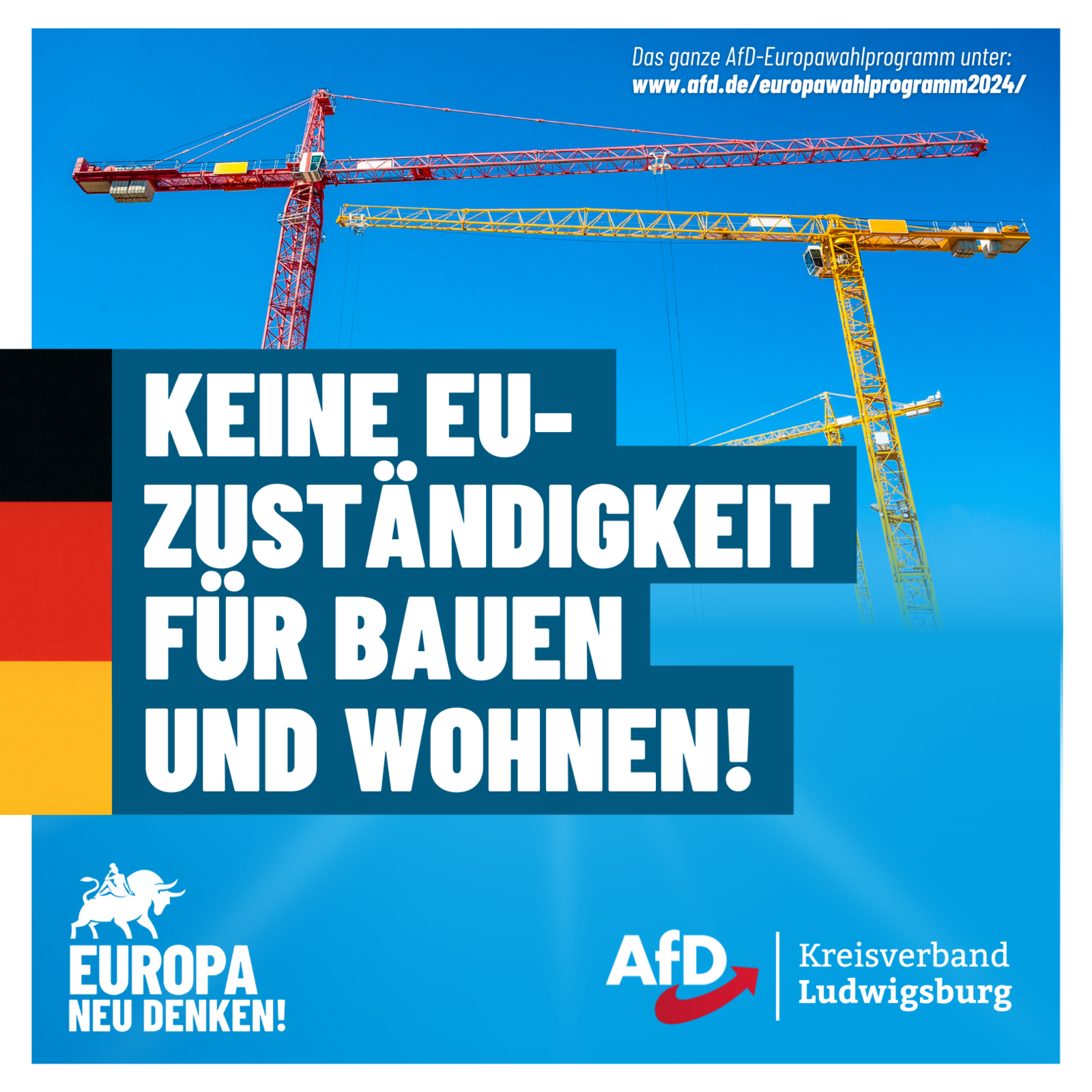 Die AfD kämpft gegen die Bestrebungen der EU, ab 2030 nur noch den Bau von sogenannten klimaneutralen Wohnhäusern zu erlauben. Ebenso weisen wir das unrealistische Ziel zurück, den kompletten Gebäudebestand in der EU mittelfristig emissionsfrei umzugestalten. Die EU will Ausnahmen nur noch für historische Gebäude, Kirchen und Verteidigungsanlagen zulassen. Diese EU-Agenda missachtet den Wunsch der Bürger nach bedarfsgerechtem und kostengünstigem Wohnraum.