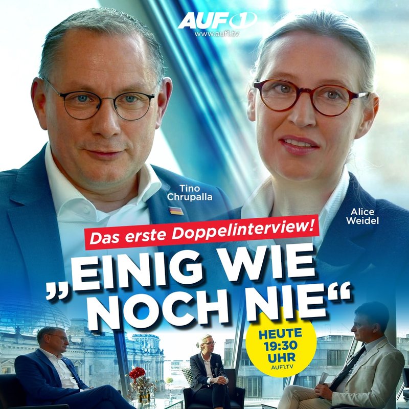 Der beliebte alternative Internet-Sender AUF1 strahlt heute Abend (27.06.) ab 19.30 Uhr bei www.auf1.tv ein Interview der AfD-Doppelspitze aus: Alice Weidel und Tino Chrupalla! Hoch aktuelle politische Fragen werden noch vor dem AfD-Parteitag beantwortet:
