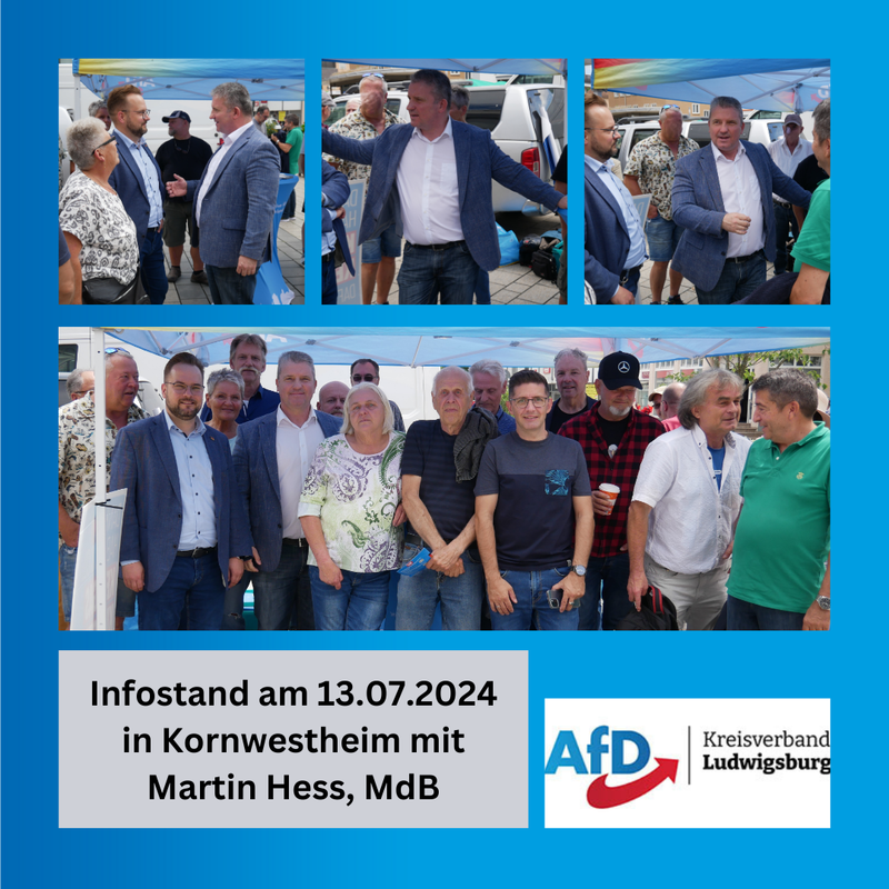 Bei bestem Wetter waren wir mit unserem Infostand in Kornwestheim. Von vielen Bürgern wurden wir freundlich, wenn auch überrascht begrüßt. Mit am Stand war Martin Hess, MdB und Kreisverbandsvorsitzender, sowie Lars Haise, Stadtrat und Vorsitzender der AfD Fraktion im Gemeinderat in Schorndorf.