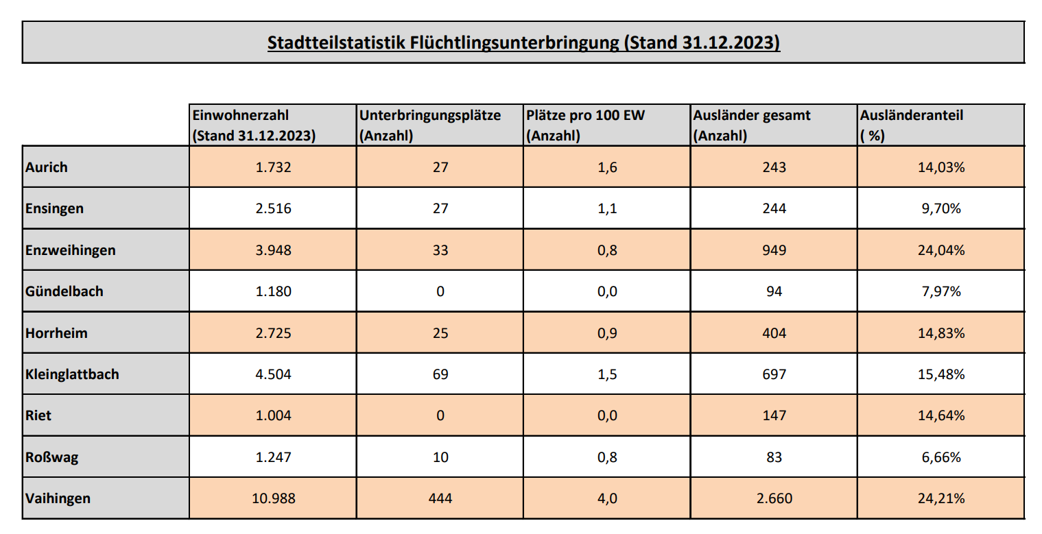 Uns erreichte eine Bürgeranfrage aus dem Zabergäu, bezüglich der Asylunterkünfte in Vaihingen-Enz. Diese wollen wir mit der „Stadtteilstatistik Flüchtlingsunterbringung (Stand 31.12.2023“ beantworten.