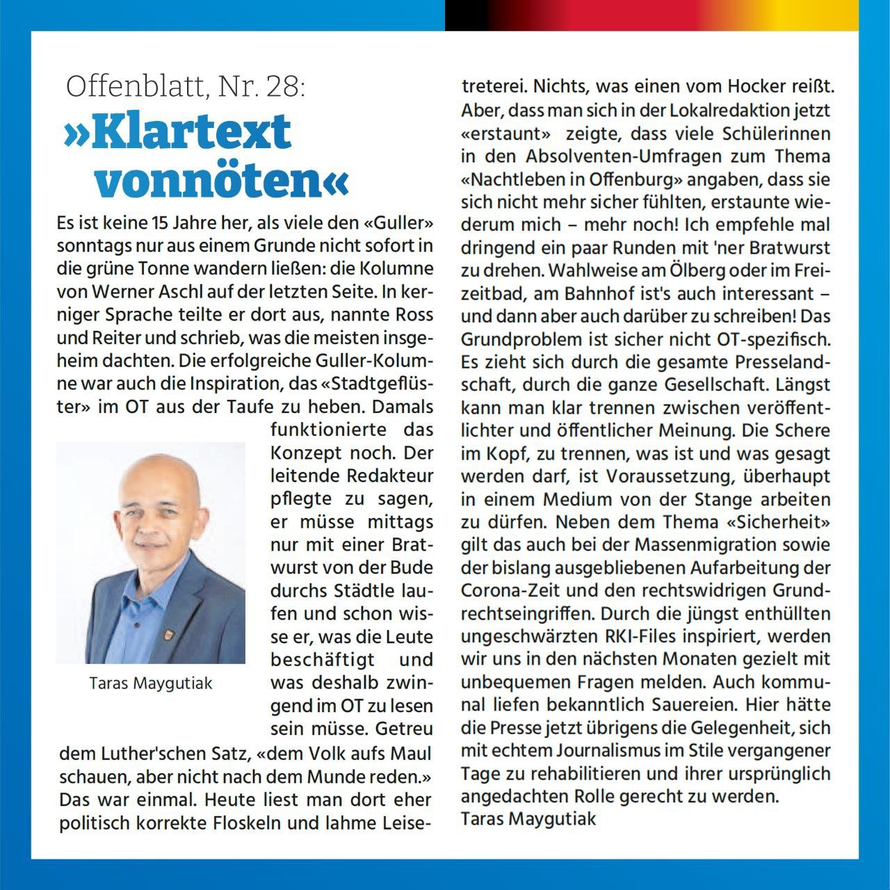 Es ist noch keine 15 Jahre her, als viele den "Guller" sonntags nur aus einem Grunde nicht sofort in die grüne Tonne wandern ließen: die Kolumne von Werner Aschl auf der letzten Seite des Blattes. In kerniger Sprache teilte er dort aus, nannte Ross und Reiter und schrieb, was die meisten insgeheim dachten. Die erfolgreiche Guller-Kolumne war seinerzeit auch die Inspiration, das "Stadtgeflüster" im OT aus der Taufe zu heben. Das Konzept funktionierte damals noch. Der leitende Redakteur pflegte zu sagen, er müsse mittags nur mit einer Bratwurst von der Bude durchs Städtle laufen und schon wisse er, was die Leute beschäftigt und was deshalb zwingend auch im OT zu lesen sein müsse. Immer getreu dem Luther'schen Satz, "dem Volk aufs Maul schauen, aber nicht nach dem Munde reden." Das war einmal. Heute liest man dort eher politisch korrekte Floskeln und lahme Leisetreterei. Nichts, was einen vom Hocker reißt. Aber, dass man sich in der Lokalredaktion jetzt "erstaunt" zeigte, dass viele Schülerinnen in den Absolventen-Umfragen zum Thema "Nachtleben in Offenburg" angaben, dass sie sich nicht mehr sicher fühlten, erstaunte wiederum mich - mehr noch! Ich empfehle mal dringend ein paar Runden mit 'ner Bratwurst zu drehen. Wahlweise am Ölberg oder im Freizeitbad, am Bahnhof ist's auch interessant - und dann aber auch darüber zu schreiben! Das Grundproblem ist sicher nicht OT-spezifisch. Es zieht sich durch die gesamte Presselandschaft, durch die ganze Gesellschaft. Längst kann man klar trennen zwischen veröffentlichter und öffentlicher Meinung. Die Schere im Kopf, zu trennen, was ist und was gesagt werden darf, ist Voraussetzung, überhaupt in einem Medium von der Stange arbeiten zu dürfen. Neben dem Thema "Sicherheit" gilt das auch bei der Massenmigration sowie der bislang ausgebliebenen Aufarbeitung der Corona-Zeit und den rechtswidrigen Grundrechtseingriffen. Durch die jüngst enthüllten ungeschwärzten RKI-Files inspiriert, werden wir uns da in den nächsten Monaten gezielt mit unbequemen Fragen melden. Auch kommunal liefen da bekanntlich Sauereien. Hier hätte die Presse jetzt übrigens die Gelegenheit, sich mit echtem Journalismus im Stile vergangener Tage zu rehabilitieren und wieder ihrer ursprünglich angedachten Rolle gerecht zu werden.