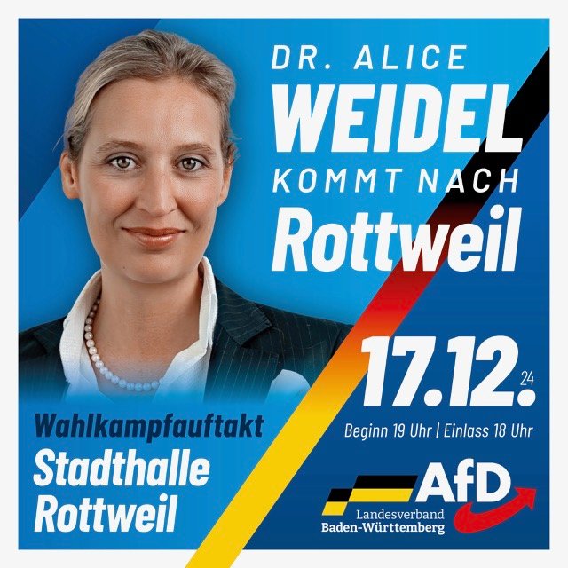 Es geht los! Am Dienstag, den 17. Dezember 2024 beginnt der AfD-Wahlkampf in Baden-Württemberg. Dr. Alice Weidel kommt nach Rottweil und stellt klar: Die Zeit ist reif. Zeit für Frieden. Zeit für sichere Grenzen. Zeit, dass sich Arbeit wieder lohnt. Zeit für bezahlbare Energie. Zeit für freie Meinung.