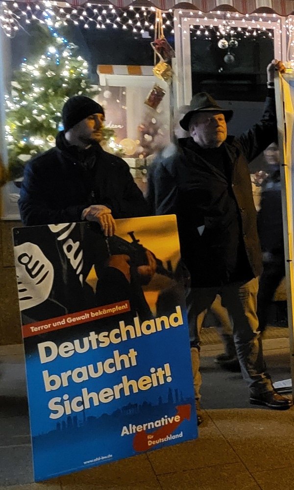 Für diese Mahnwache haben wir ein viele Jahre altes AfD-Wahlplakat aus dem Keller geholt. Wäre die AfD damals an die Regierung gekommen, hätte es den Blutzoll von Magdeburg wahrscheinlich nie gegeben.