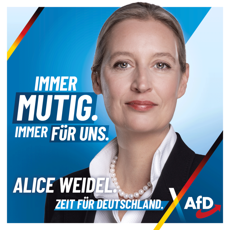 Mit Dr. Alice Weidel an unserer Spitze kann sich unser Land wieder in ein Land mit Wohlstand und Sicherheit entwickeln. Mutig und stark vertritt sie unsere AfD und macht Politik im Sinne unseres Grundgesetzes!