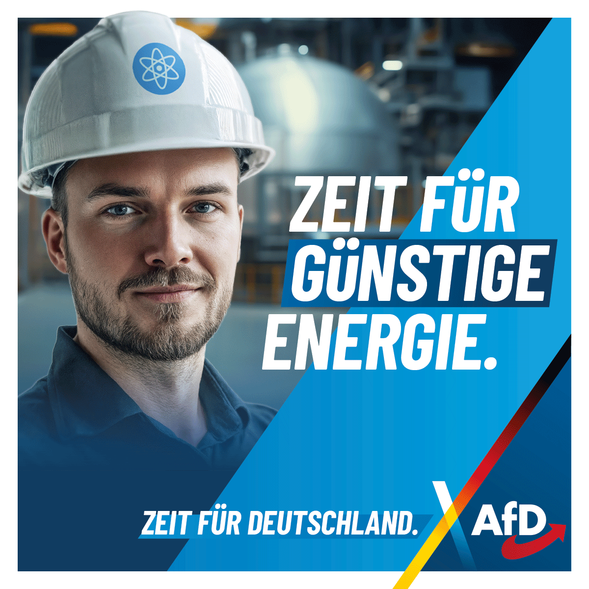 Die AfD steht für günstige Energie durch den Wieder­einstieg in die Kernkraft. Investitionen in zukunftsfähige Reaktoren der neuesten Generation müssen getätigt werden. Deutschland hat zudem die modernsten Kohlekraftwerke weltweit, deshalb fordert die AfD längere Laufzeiten der Kohlekraftwerke.
