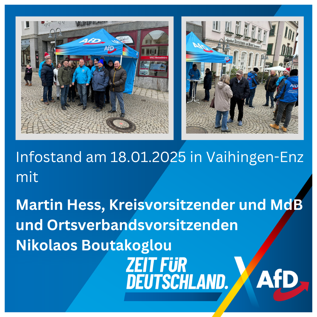 Dass sich der Ortsverband Vaihingen-Enz im Wahlkampf befindet, haben sie am Samstag beim Infostand mehr als bewiesen! So waren viele aktive Mitglieder am Stand, welche die Bürger mit Infomaterialien versorgt und zahlreiche gute Gespräche geführt haben. Ortsverbandsvorsitzender Nikolaos Boutakoglou konnte dabei das erste Mal die neuen Flyer verteilen, auf die wir ganz besonders stolz sind!