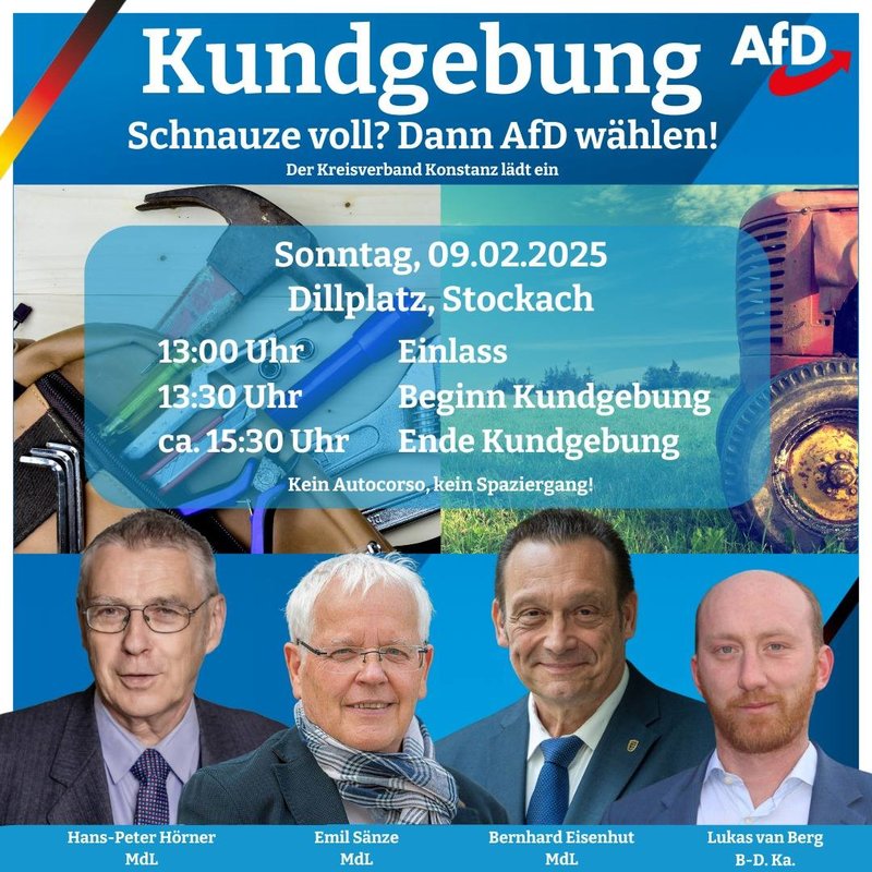 Der AfD-Kreisverband Konstanz macht am Sonntag, den 9. Februar 2025 um 13:30 Uhr in Stockach auf dem Dillplatz eine Kundgebung, besonders auch für unsere fleißigen Handwerker und Bauern der Region, denn