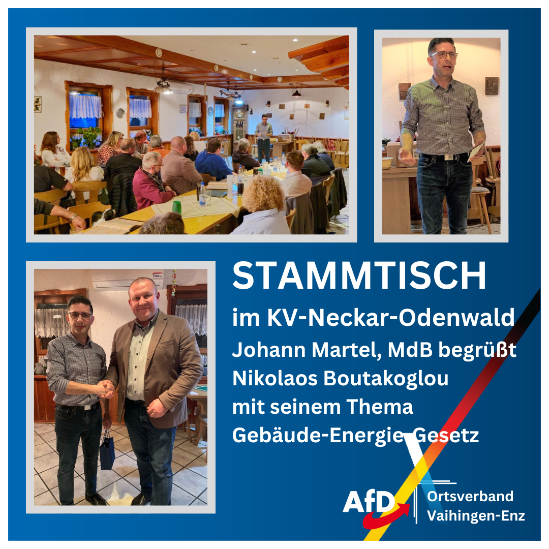 Der frisch gebackene MdB und Kreissprecher des KV Neckar-Odenwald Johann Martel lud Nikolaos Boutakoglou, Ortsverbandsvorsitzender in Vaihingen-Enz, am 21.03.2025 zum Stammtisch nach Obrigheim ein.