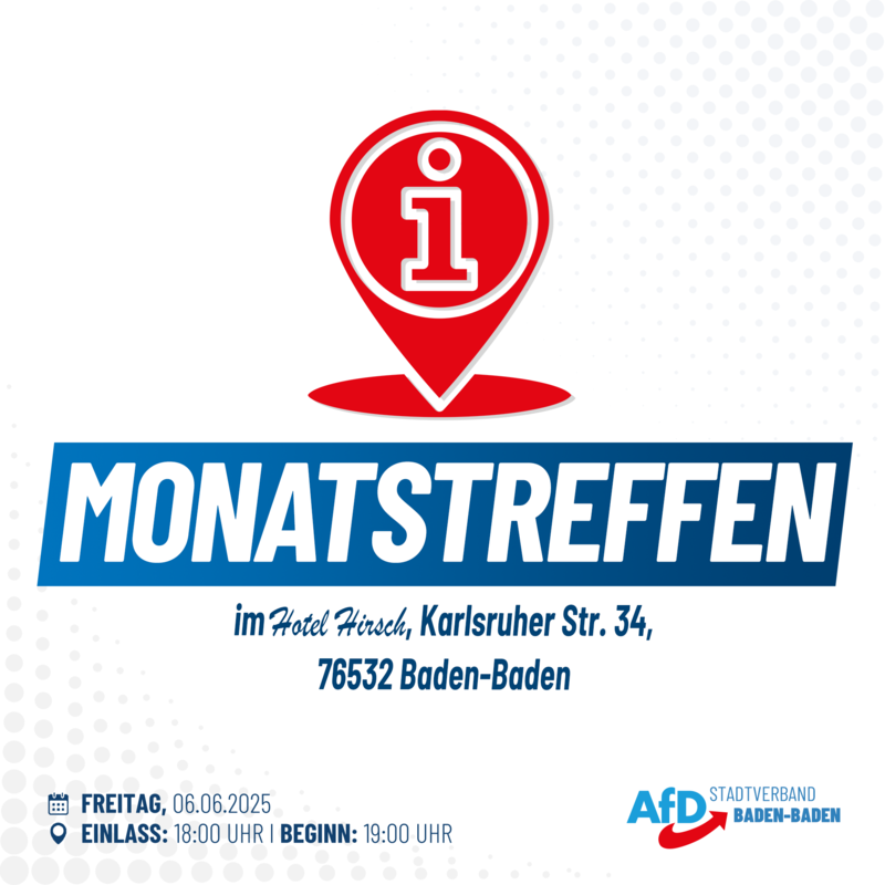 Der Stadtverband Baden-Baden der Alternative für Deutschland (AfD) lädt am Freitag, den 6. Juni 2025, um 18.00 Uhr alle interessierten Bürger zu seinem Monatstreffen in das Hotel Hirsch, Karlsruher Str. 34, 76532 Baden-Baden (Haueneberstein) ein.