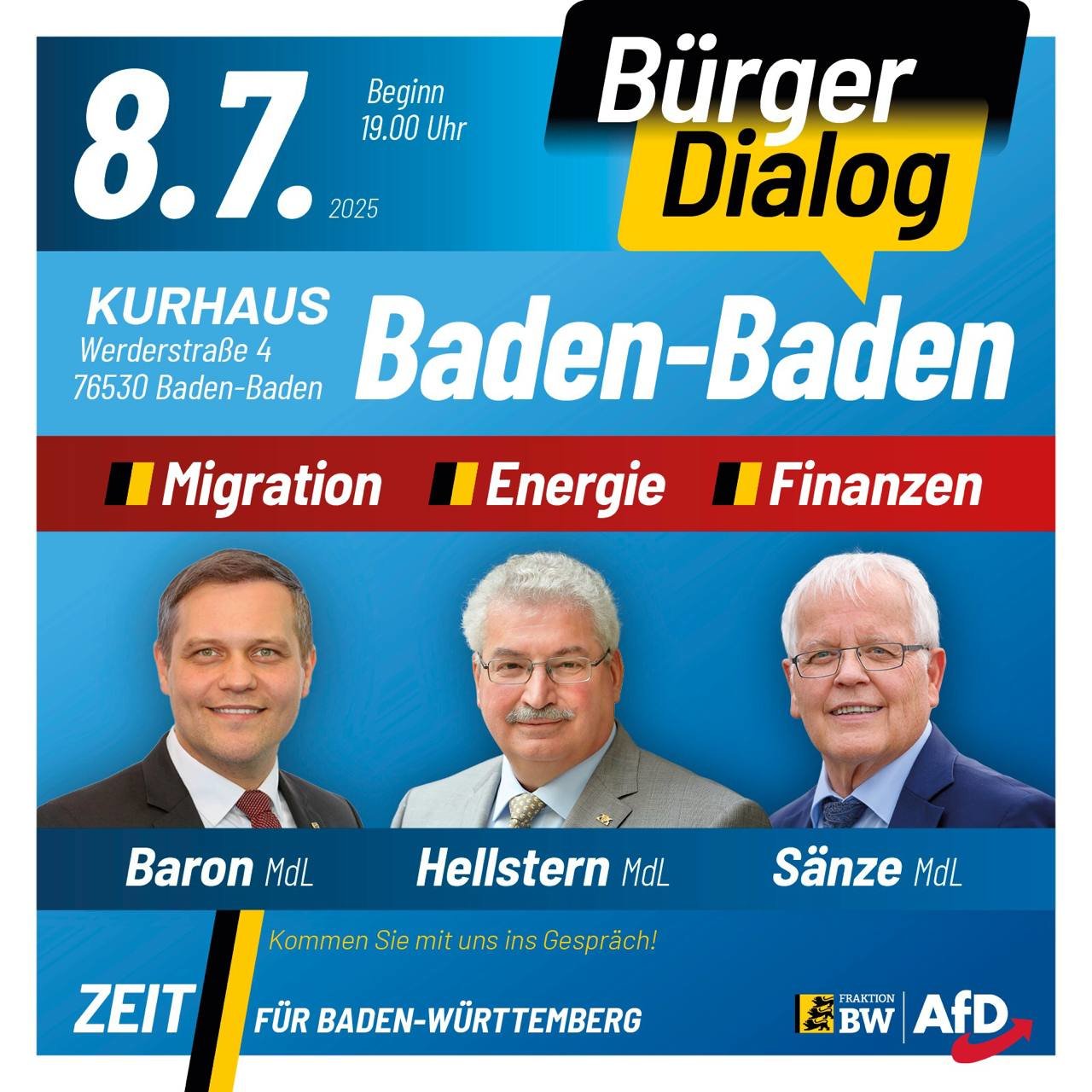 Einladung zum Bürgerdialog mit Anton Baron MdL, Uwe Hellstern MdL und Emil Sänze MdL, im Kurhaus Baden-Baden. Themen des Abends werden Migration, Energie und Finanzen sein.