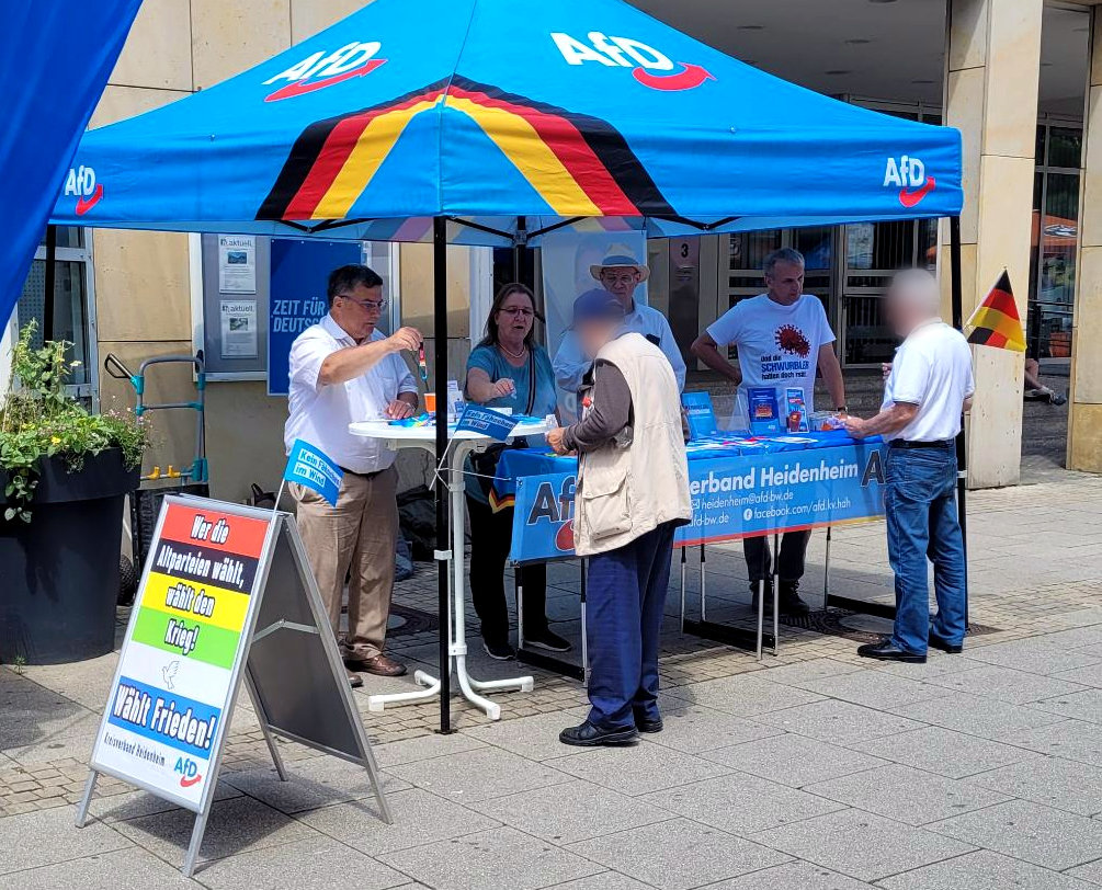 Bei herrlichem Sommerwetter zeigte der AfD Kreisverband Heidenheim wieder einmal mehr Präsenz und Bürgernähe. Der AfD Direktkandidat für die Landtagswahl 2026, Dr. Jürgen Müller, hatte ein offenes Ohr für die Anliegen der Bürger. Auch der Vorsitzende der AfD Fraktion im Heidenheimer Kreistag, Heiko Röllig, stand zusammen mit weiteren Parteikollegen Rede und Antwort.