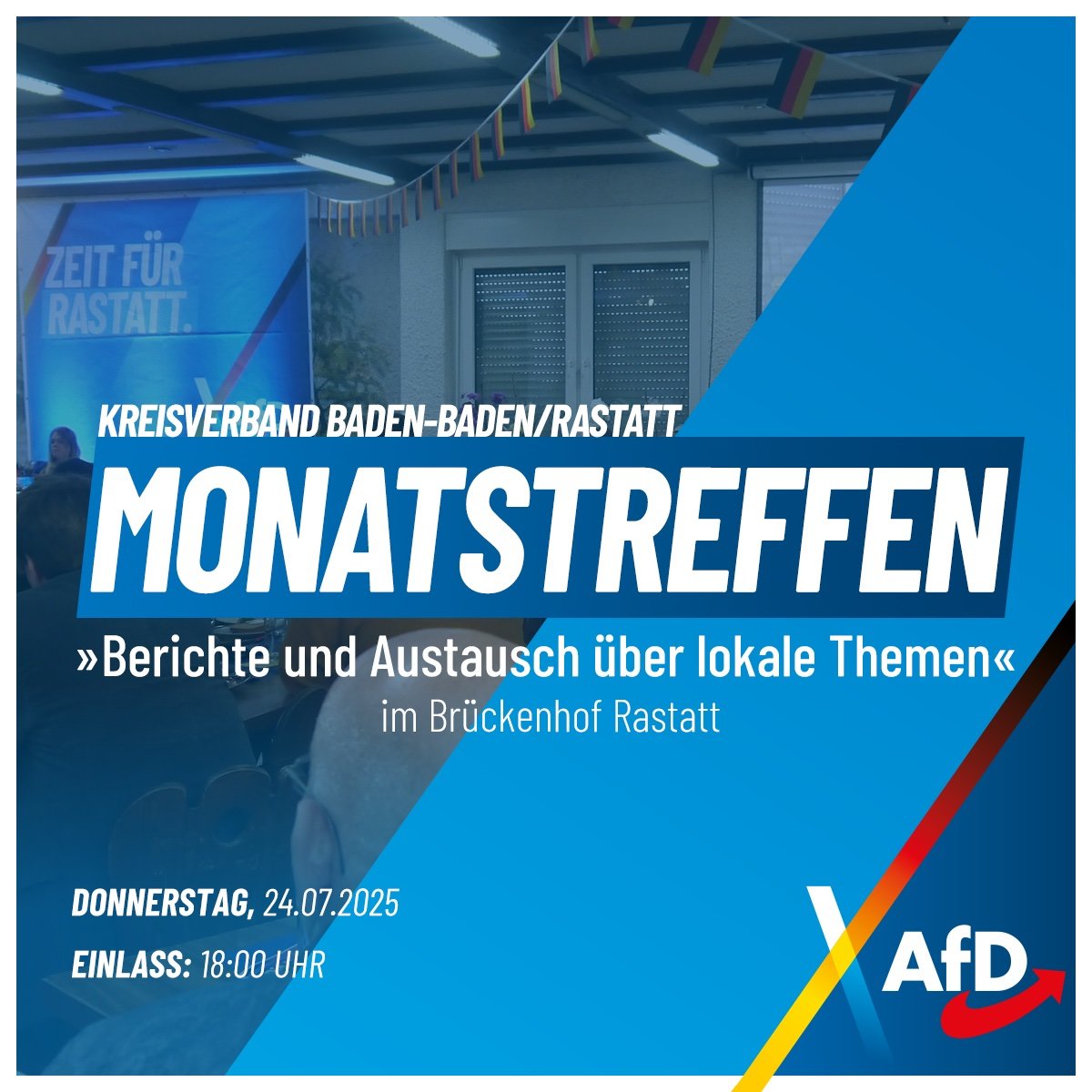 Der Kreisverband Baden-Baden/Rastatt der Alternative für Deutschland (AfD) lädt am Donnerstag, den 24. Juli 2025, um 18.00 Uhr alle interessierten Bürger zu seinem politischen Stammtisch im Hotel Brückenhof in Rastatt ein.