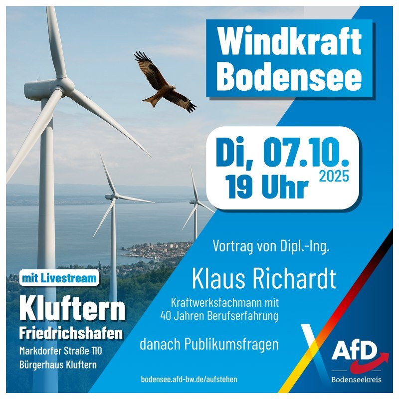 Im Bodenseekreis sollen an den drei Standorten Markdorf, Betenbrunn und Überlingen Windkraftanlagen errichtet werden. Wir werfen schon heute einen Blick darauf, was damit auf unsere Region zukommt und laden ein zum Vortrag von Dipl.-Ing. Klaus Richardt am Dienstag, den 7. Oktober 2025 um 19 Uhr ins Bürgerhaus Kluftern, Markdorfer Straße 110, 88048 Friedrichshafen.