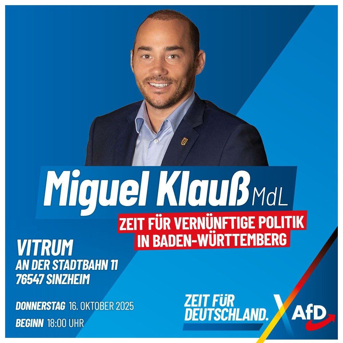 Wir laden Sie herzlich zum Monatstreffen des Kreisverbands am Donnerstag, den 16. Oktober 2025 im Restaurant "Vitrum" in Sinzheim ein. Als Gastredner begrüßen wir Miguel Klauß MdL. Thema des Abends wird "Zeit für vernünftige Politik in Baden-Württemberg" sein.