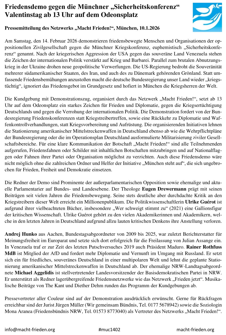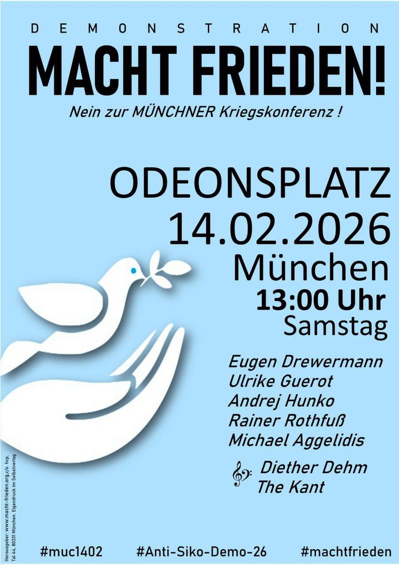 Am Samstag, den 14. Februar 2026 um 13 Uhr demonstrieren wir für Frieden auf dem Odeonsplatz in München. Dort sprechen