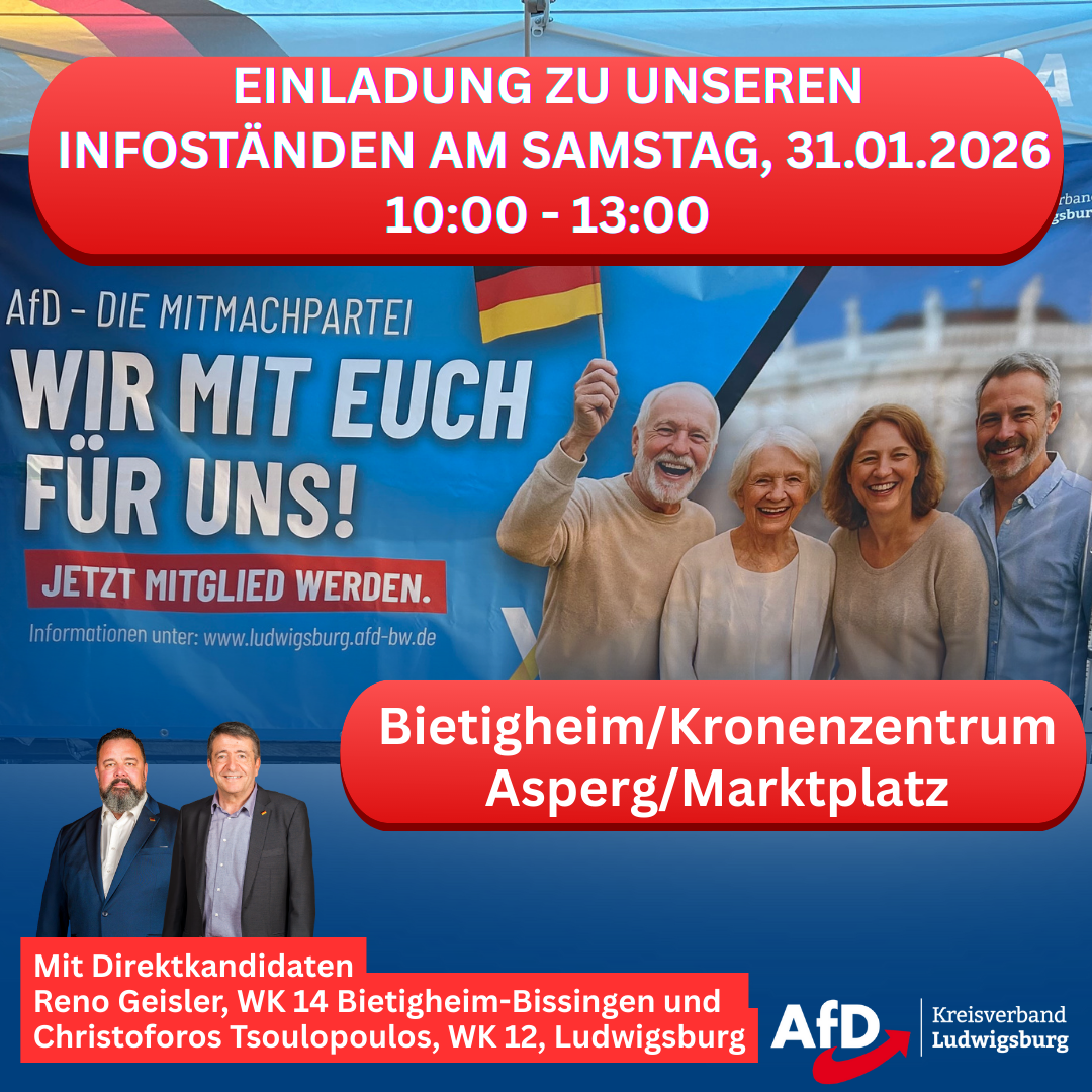 Liebe Mitglieder, Förderer und Freunde unserer AfD Ludwigsburg, folgende Infostände sind bis zur Landtagswahl am 08.03.026 geplant. Sollten sich Änderungen erge...