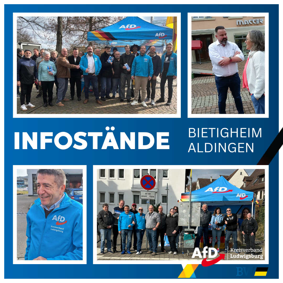 Die letzten Infostände vor der Wahl werden wir in Ludwigsburg und Markgröningen aufstellen. Kommt vorbei, kommt ins Gespräch, trefft Gleichgesinnte – und denkt daran, am 08.03.2026 wählen zu gehen. Gemeinsam setzen wir ein starkes Zeichen in unserem schönen Schwabenland!