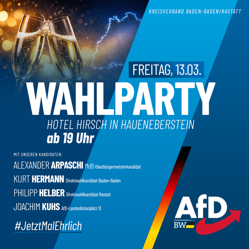 wir laden herzlich zu unserer Wahlparty mit Alexander Arpaschi MdB sowie unseren Kandidaten Kurt Hermann, Philipp Helber und Joachim Kuhs, am Freitag den 13.03.2026 im Hotel Hirsch in Haueneberstein ein.