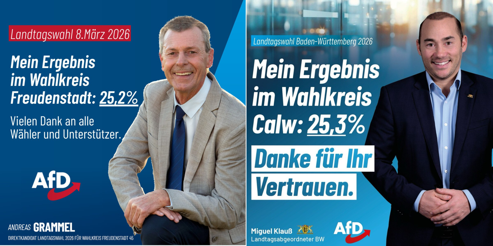 Mit überzeugenden Ergebnissen in ihren Wahlkreisen ziehen Andreas Grammel (Wahlkreis Freudenstadt) und Miguel Klauß MdL (Wahlkreis Calw) für die Alternative für Deutschland (AfD) in den Landtag von Baden-Württemberg ein.