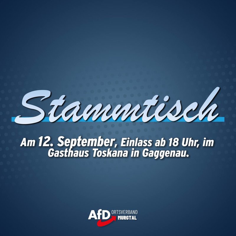 Einladung zum Stammtisch des Ortsverbands Murgtal, am Freitag, den 12. September 2025 ab 18:00 Uhr im Gasthaus Toskana in Gaggenau. Wir freuen uns auf eine rege Te...