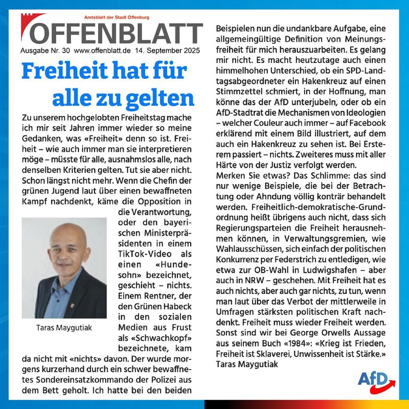 Freiheit hat für alle zu gelten! Taras Maygutiaks Beitrag im Meinungsforum des Offenblatt