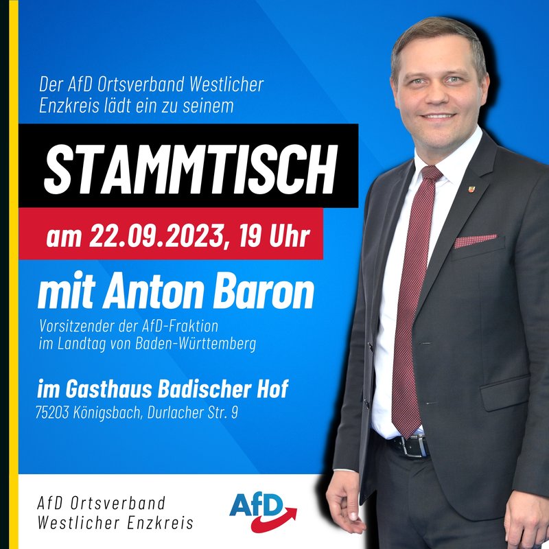 Sehr geehrte Mitglieder und Förderer des AfD Kreisverbandes Pforzheim/Enzkreis, gerne möchten wir Sie auf den Stammtisch des OV Westlicher Enzkreis am 22.09.2023...