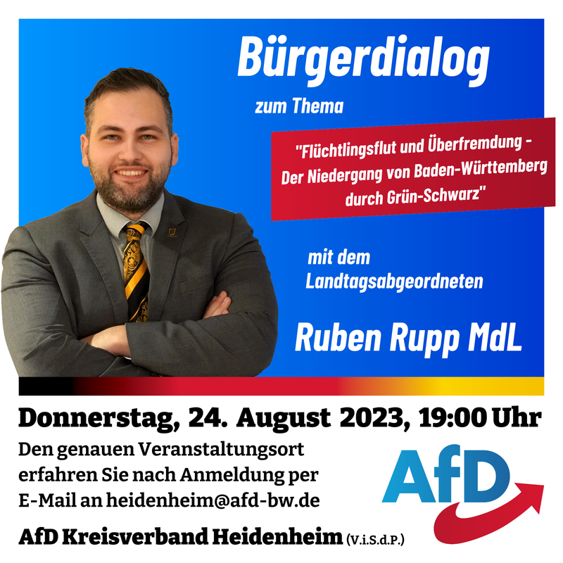 "Flüchtlingsflut und Überfremdung - Der Niedergang von Baden-Württemberg durch Grün-Schwarz". Bürgerdialog mit dem Landtagsabgeordneten Ruben Rupp MdL am Don...