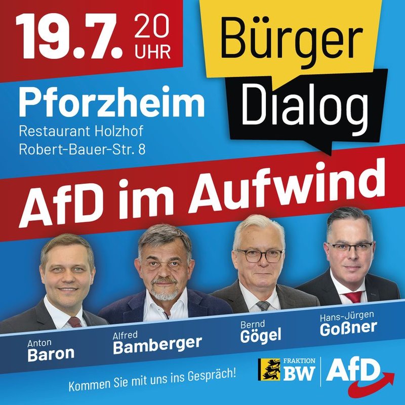 Die AfD Fraktion im Landtag von Baden-Württemberg lädt am 19. Juli ab 20 Uhr zum Bürgerdialog ein.