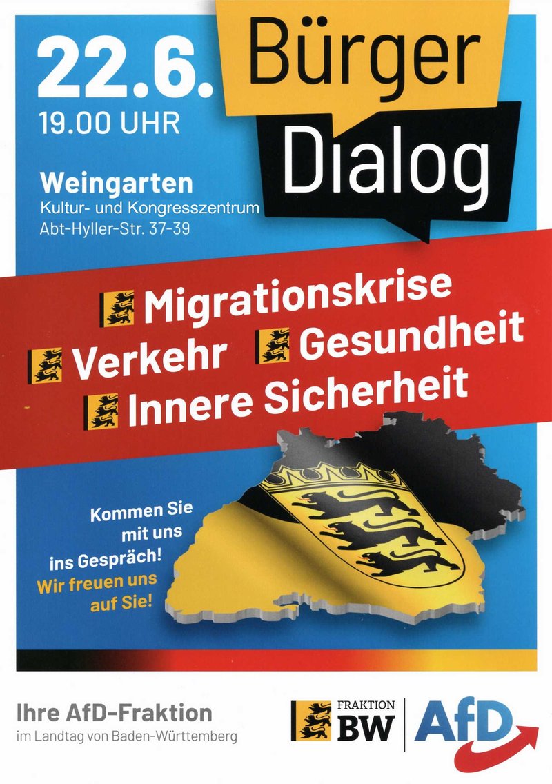 Eine Veranstaltung der AfD Fraktion im Landtag Baden-Württemberg am Donnerstag 22.06.2023 19:00 Uhr Kultur- und Kongresszentrum, 88250 Weingarten Abt-Hyller-Str....