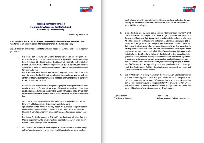 Stellungnahme der AfD-Kreistagsfraktion im Ortenaukreis zum Appell zur Integrations- und Flüchtlingspolitik von vier Oberbürgermeistern des Ortenaukreises und Landrat Scherer an die Bundesregierung