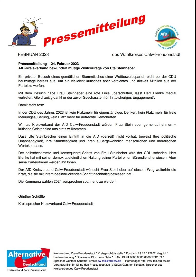 Pressemitteilung - 24. Februar 2023 AfD-Kreisverband bewundert mutige Zivilcourage von Ute Steinheber Ein privater Besuch eines gemütlichen Stammtisches einer We...