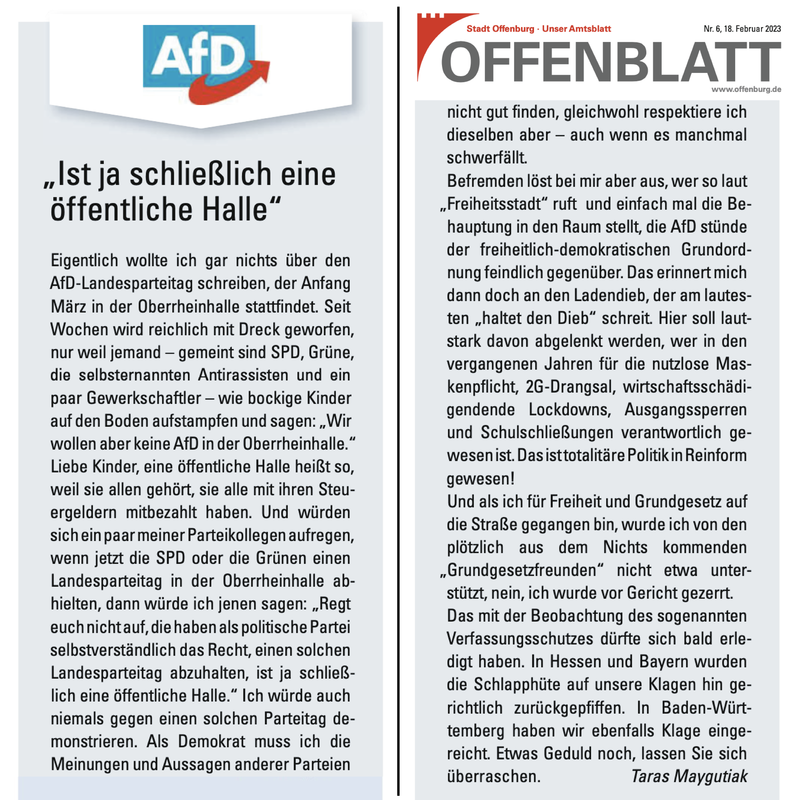"Ist ja schließlich eine öffentliche Halle" - Taras Maygutiak im Offenblatt zum Diskussion um den AfD Parteitag in Offenburg