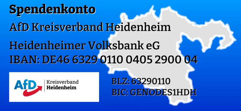 Unterstützen Sie uns durch Ihre Spende ! Spenden an politische Parteien sind steuerlich begünstigt. Das Spendenkonto des AfD Kreisverbandes Heidenheim: Heidenheim...