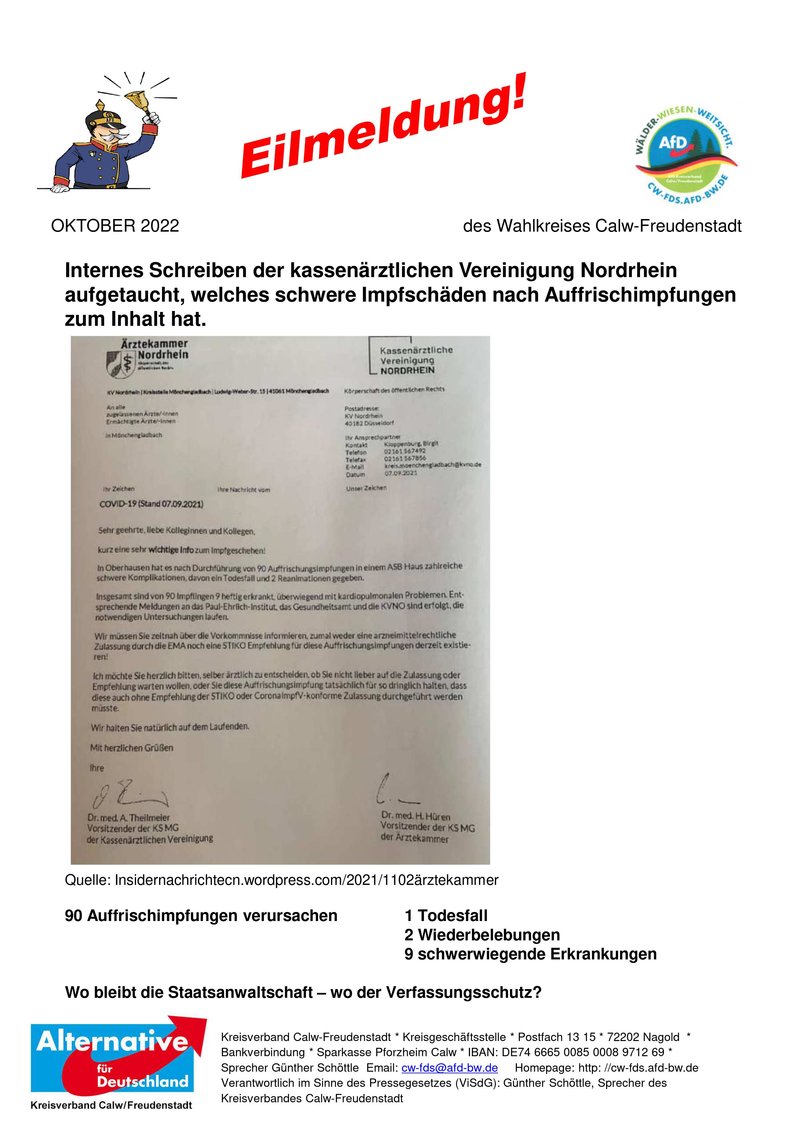 Eilmeldung Ärztekammer über Auswirkungen einer Auffrischimpfung