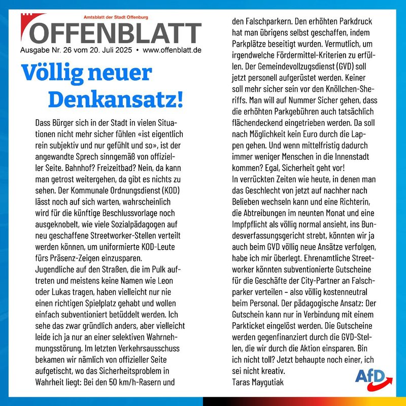 Wenn Realität und überspitzte Glosse sich nichts schenken: Stadtrat Taras Maygutiak im "Meinungsforum" des OFFENBLATT, dem Amtsblatt der Stadt Offenburg.