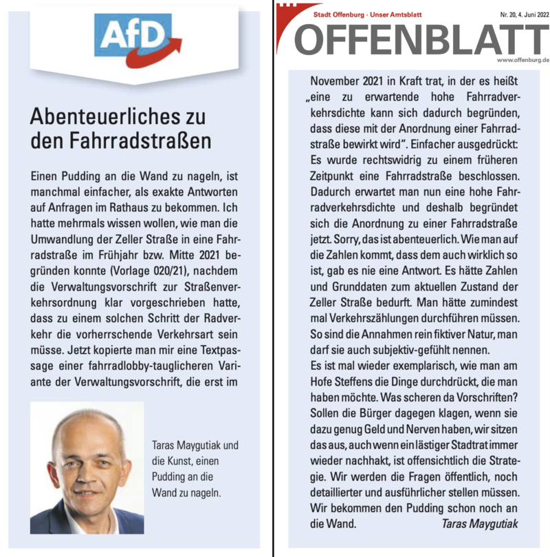 Taras Maygutiaks Beitrag im Offenblatt - Abenteuerliches zu den Fahrradstraßen