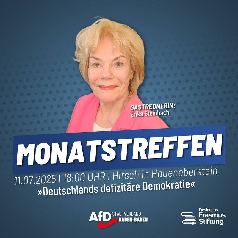 Der Stadtverband Baden-Baden der Alternative für Deutschland (AfD) lädt am Freitag, den 11. Juli 2025, um 18.00 Uhr alle interessierten Bürger zu seinem Monatstr...