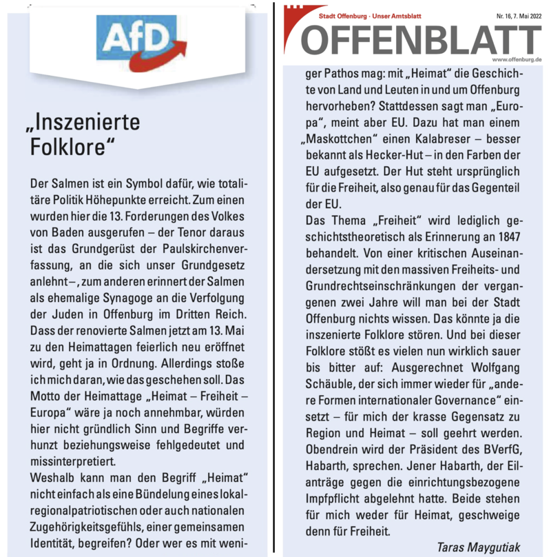 Taras Maygutiaks Beitrag im Meinungsforum des Offenblatt, dem Amtsblatt der Stadt Offenburg