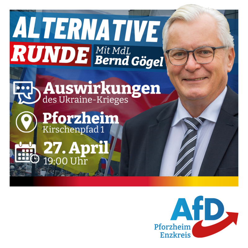 Liebe Freunde und Mitglieder des Kreisverbandes Pforzheim/Enzkreis, Unser Gastredner Bernd Gögel freut sich über Ihren Besuch. Thema: Auswirkungen des Ukrainekri...
