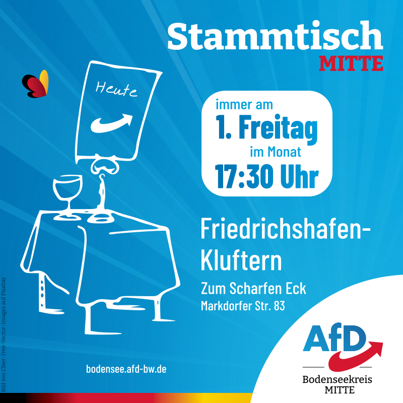 DER STAMMTISCH FÄLLT LEIDER AUS, WEIL DER GASTHOF BEREITS IN DER SOMMERPAUSE IST. Am Freitag, den 4. Juli 2025 um 17:30 Uhr ist wieder der AfD-Stammtisch Mitte i...
