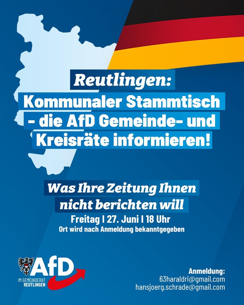 Einladung zum Stammtisch des AfD-Kreisverbands Reutlingen Die AfD-Fraktion im Reutlinger Gemeinderat lädt Sie gemeinsam mit der AfD-Fraktion im Kreistag Reutlinge...