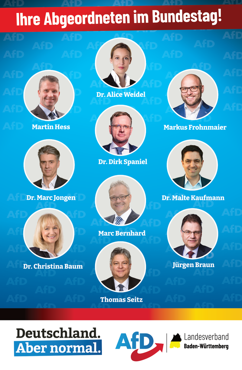 Mit soliden 10,3 Prozent zieht die AfD erneut in den Deutschen Bundestag ein. Mit dabei sind natürlich auch unsere Abgeordneten aus Baden-Württemberg. Wir gratulieren recht herzlich: 1. Dr. Alice Weidel 2. Martin Hess 3. Dr. Dirk Spaniel 4. Markus Frohnmaier 5. Dr. Marc Jongen 6. Marc Bernha...