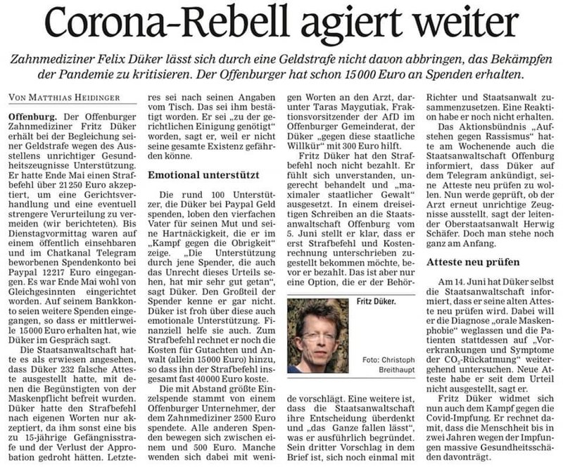 Grundrechte sind unveräußerlich, müssen weder ertestet, noch erimpft werden. Das nur zur Erinnerung. Zu diesem Beitrag wurde ich schon wieder von Zeitungsartikeln inspiriert. Es geht um das fortgesetzte Kesseltreiben, das gegen Dr. Düker veranstaltet wird. Initiiert ist das Ganze von einer Handv...