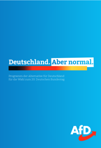 Deutschland. Aber normal. Wenn Sie sich fragen, wie das bei dem Zustand, in dem sich unser Land befindet, überhaupt noch möglich sein soll, haben wir die Antwort. Das Programm der Alternative für Deutschland für die Bundestagswahl 2021! Verlassen Sie sich nicht auf die ideologisch...