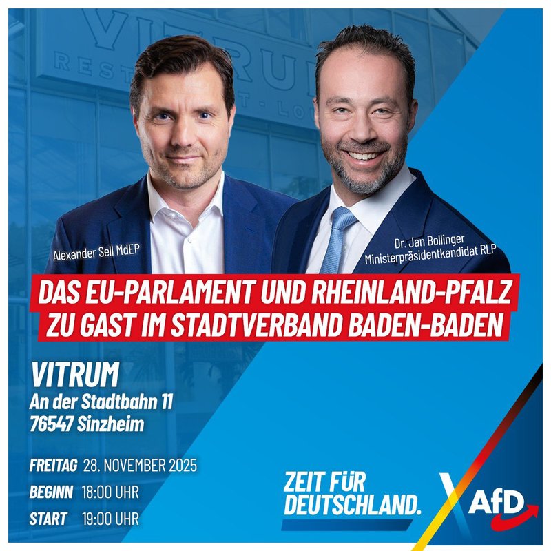 Der Stadtverband Baden-Baden der Alternative für Deutschland (AfD) lädt am Freitag, den 28. November 2025, um 18.00 Uhr alle interessierten Bürger zu seinem Mona...