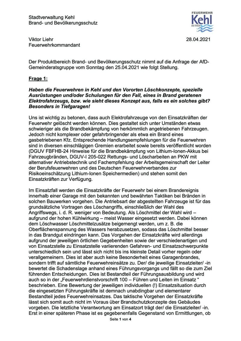 Anfrage der AfD- Gemeinderatsgruppe: Frage 1: Haben die Feuerwehren in Kehl und den Vororten Löschkonzepte, spezielle Ausrüstungen und/oder Schulungen für den Fall, eines in Brand geratenen Elektrofahrzeugs, bzw. wie sieht dieses Konzept aus, falls es ein solches gibt? Besonders in Tiefgaragen!...