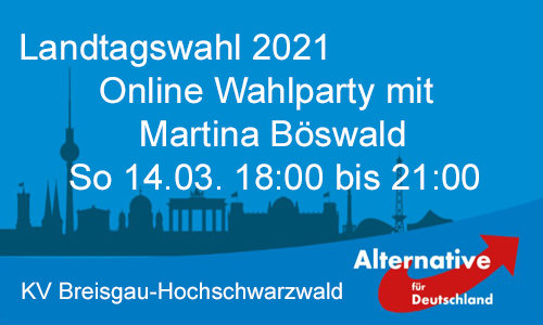 AfD KV Breisgau-Hochschwarzwald Grunern, den 14. März 2021   "Online-Wahlparty" So., 14. März 2021 18:00 - 21:00 (CET) Nehmen Sie an meinem Meeting per Computer, Tablet oder Smartphone teil. https://global.gotomeeting.com/join/640307909 Sie können sich auch über ein Telefon einwählen. (...
