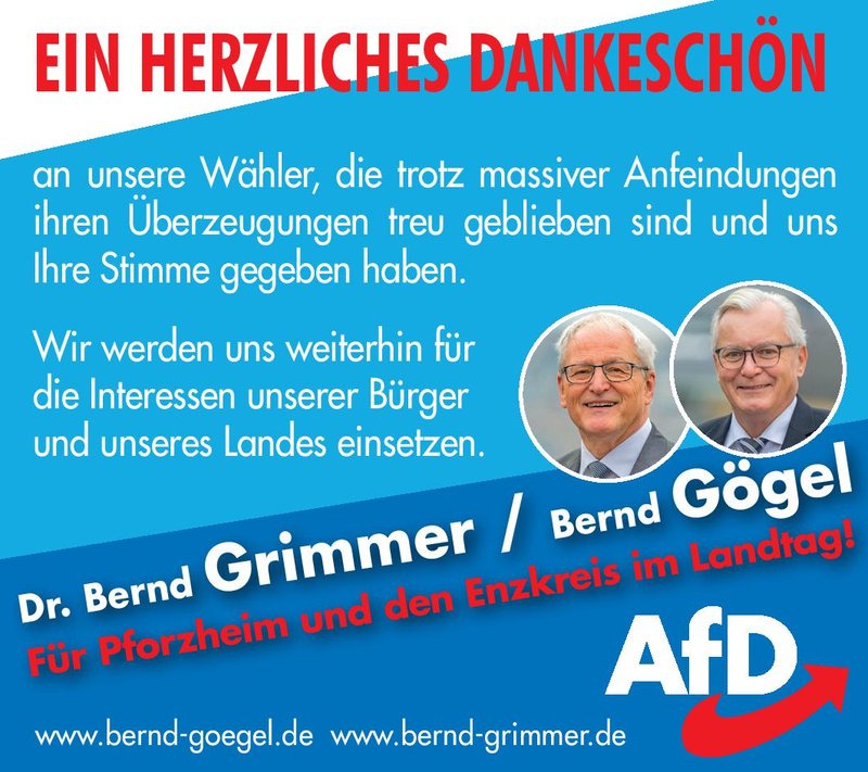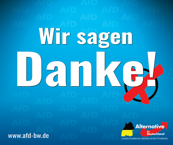 Wir sagen Danke!   Danke an alle Bürger, die der AfD ihr Vertrauen ausgesprochen haben. Danke an die Landtagskandidaten, die vielen Wahlhelfer, die Parteifreunde, und allen anderen, die uns im Wahlkampf so tatkräftig unterstützt haben.